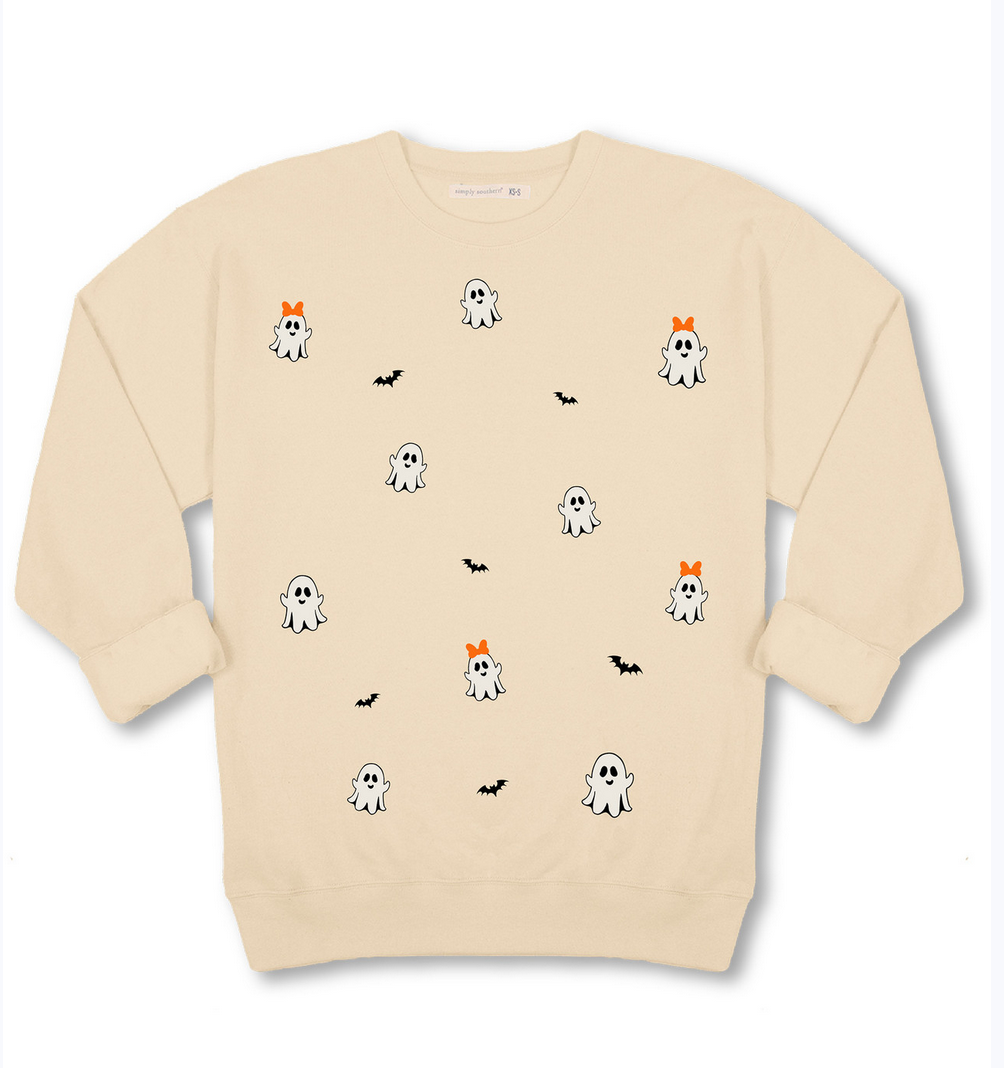 Sand long sleeve crew with ghosts and bats scattered over the front. 50% cotton/50% polyester blend. Range sizing.