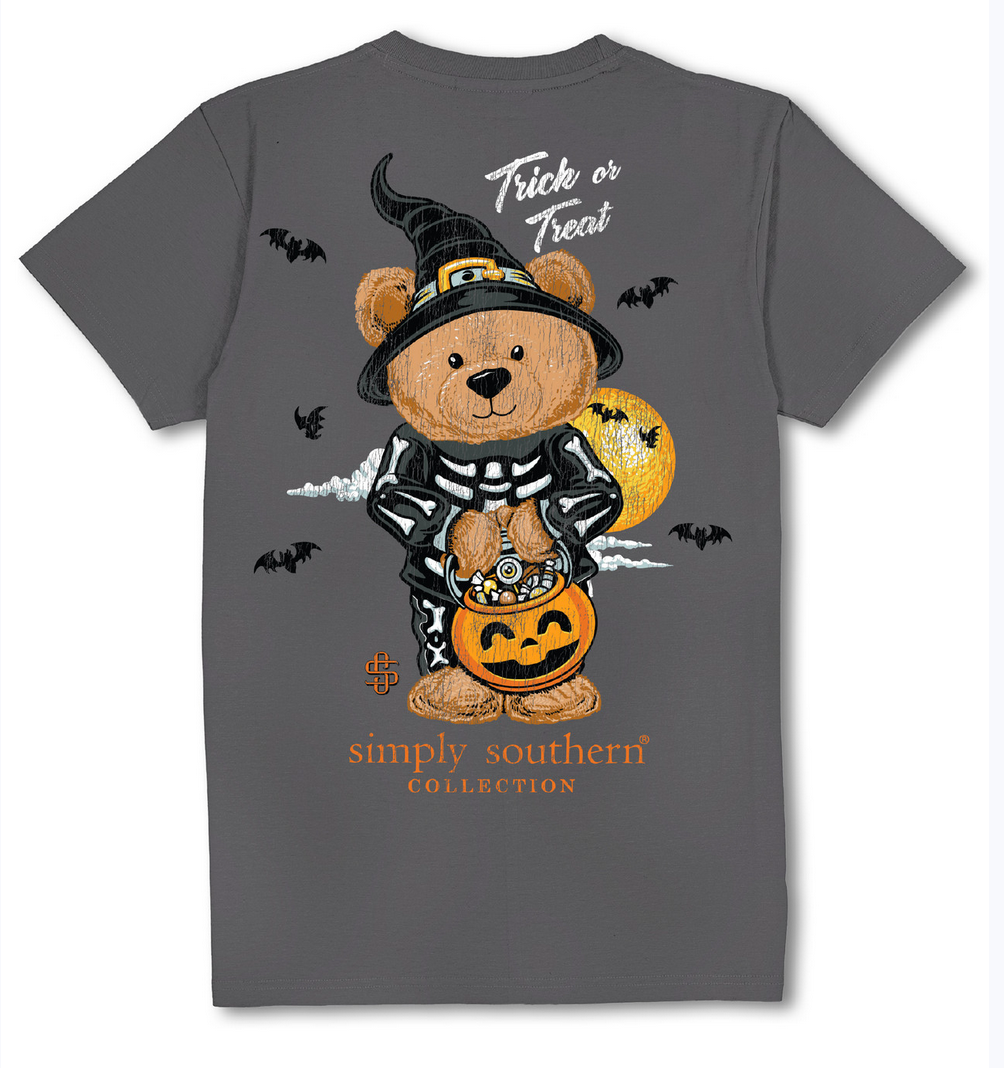 Mineral washed coal short sleeve shirt with the phrase 'Trick or Treat' and a teddy bear dressed up for Halloween holding a candy container. Simply Southern logo below. Similar design on left chest. 100% cotton. Unisex sizing.